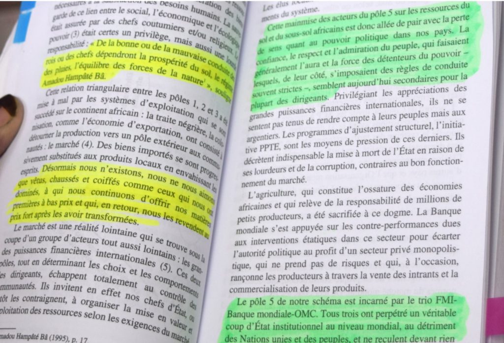 « Le fait que l’ensemble des États africains soient aujourd’hui confrontés à des difficultés semblables et que celles-ci persistent même en cas de changement d’équipe en dit long sur l’impact des facteurs externes dans le sabotage des économies et des démocraties » (p.162). Voici l’une des nombreuses phrases et pensées de cet ouvrage qui mènent à méditer.