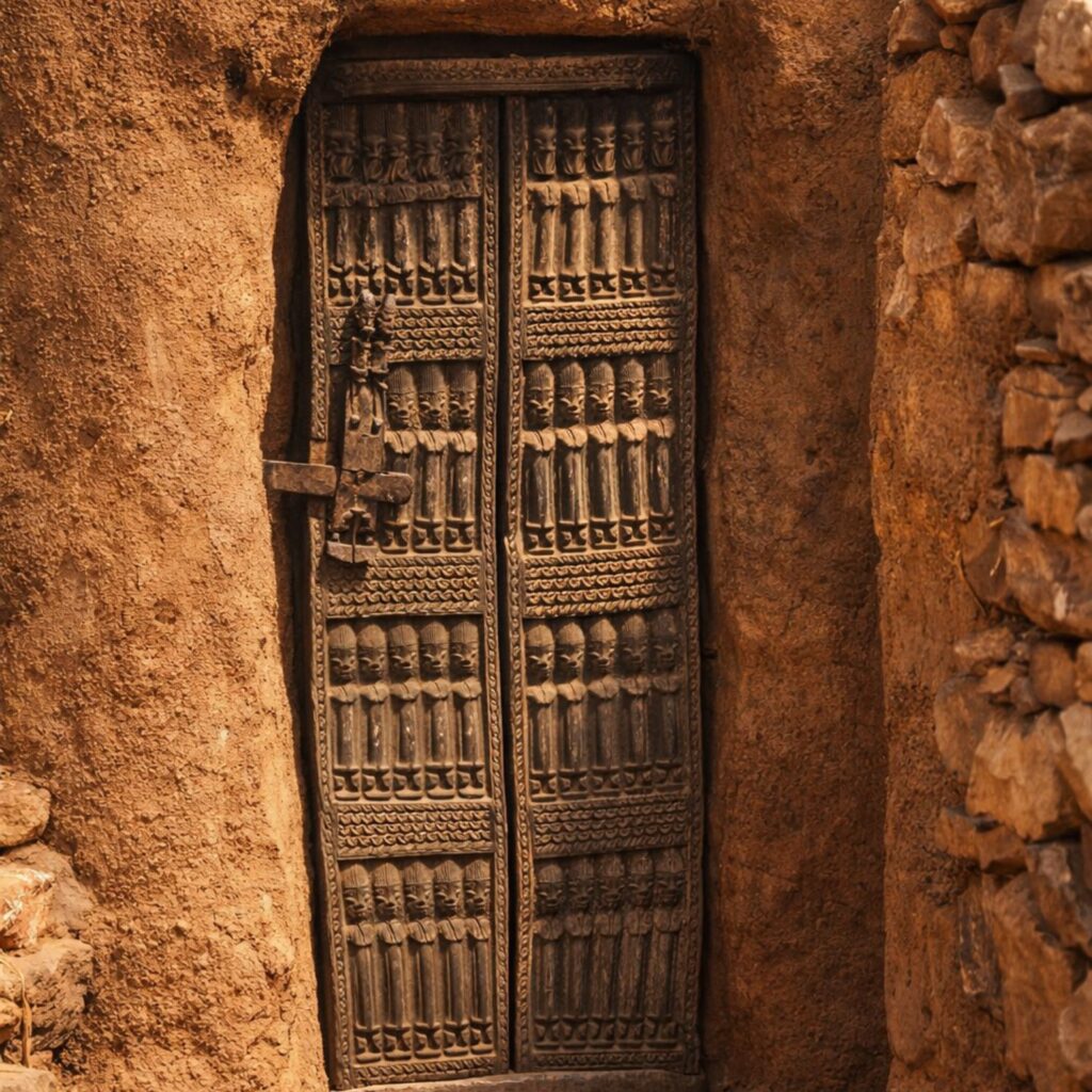 Les falaises de Bandiagara offrent le paysage saisissant de villages construits dans la roche, avec des concessions adossées aux parois, en harmonie avec la nature.